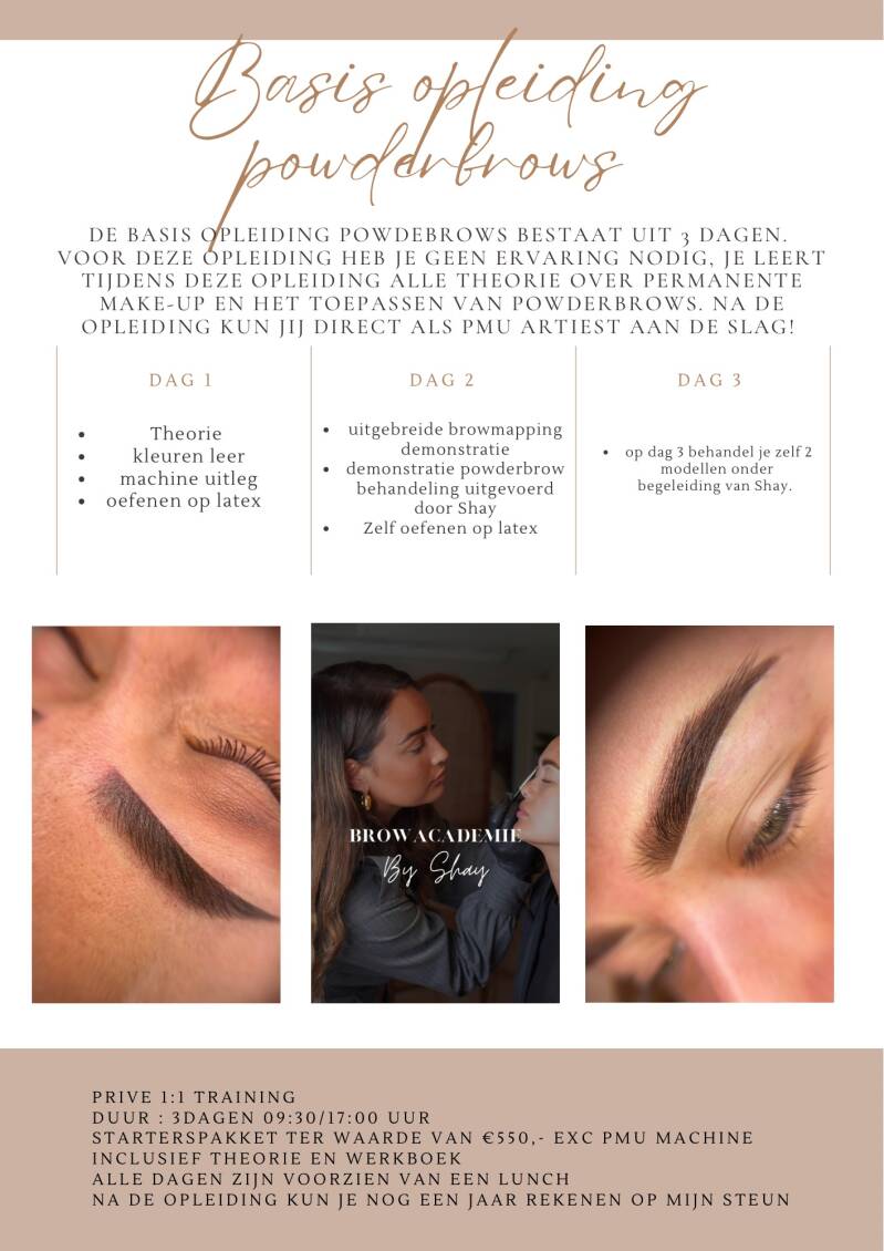 Welkom bij By shay’s privé training Ombré Powder Brows! Deze training is perfect voor iedereen die ervan droomt om de eerste stap in de pmu wereld te zetten. Tijdens deze opleiding leer je alles wat je nodig hebt om prachtige powderbrows te creëren. Alle focus is op jou gericht doordat deze training 1 op 1 is , na het volgen van deze 4 daagse opleiding kun jij zelfstandig een powderbrow behandeling uitvoeren.